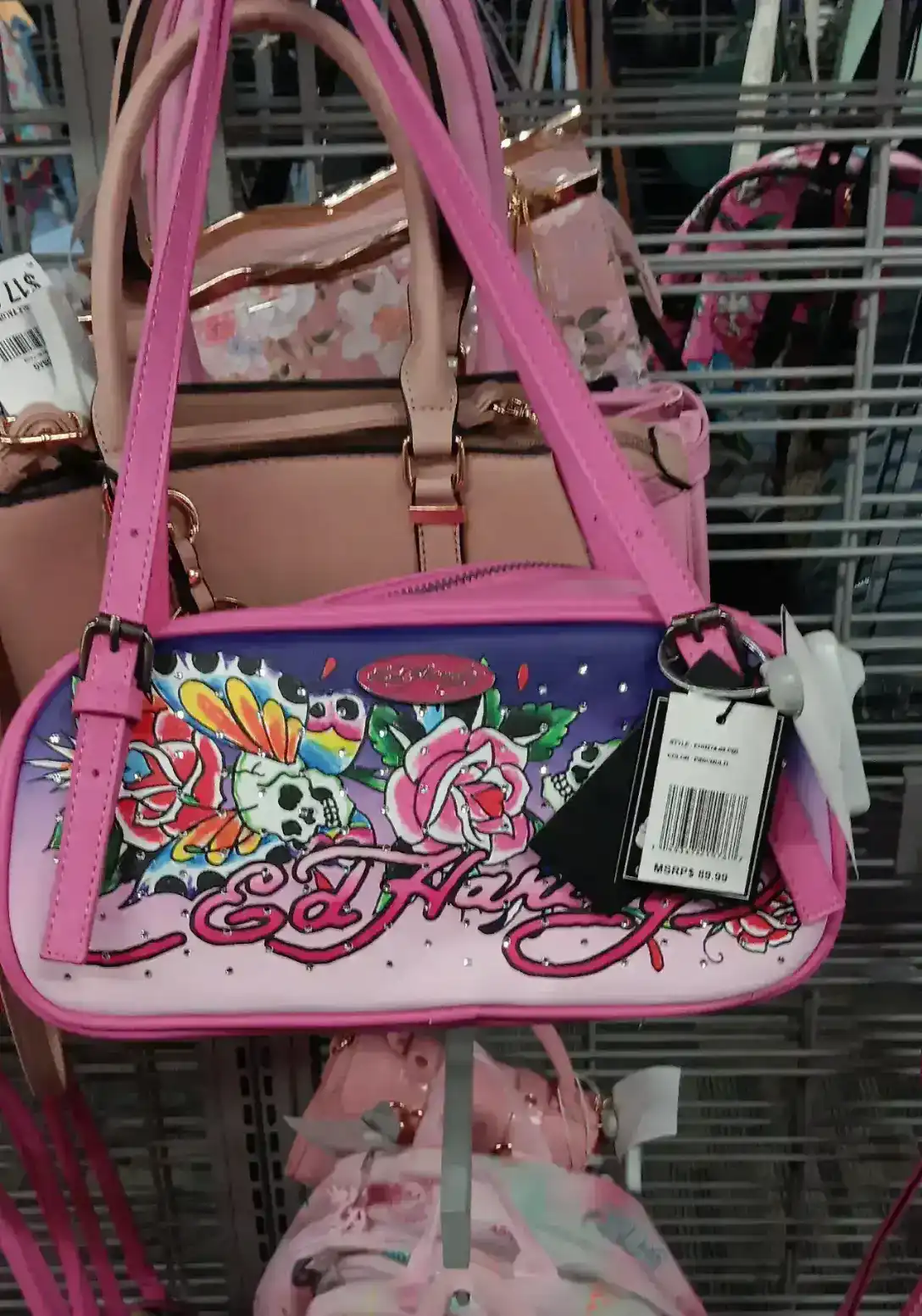 A stylish Ed Hardy handbag featuring vibrant floral designs and a signature logo. Perfect for adding a pop of color to any outfit.