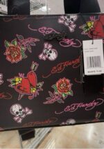 A stylish tote bag featuring Ed Hardy’s signature designs with skulls, hearts, and roses in vibrant colors on a black background.