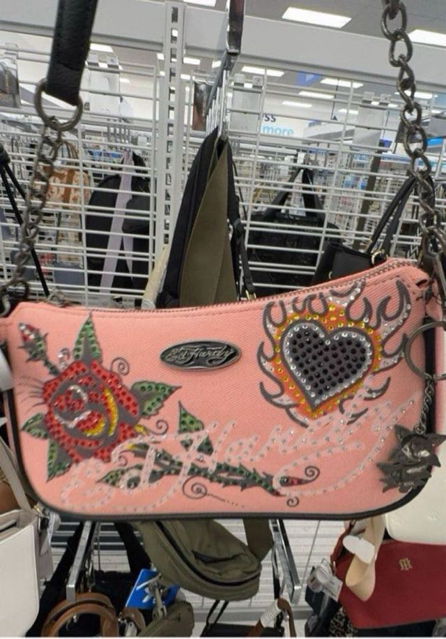 A stylish pink handbag featuring decorative embellishments including a rose, heart, and flame designs.