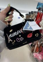 A stylish mini handbag featuring colorful embroidery with designs including the Eiffel Tower, hearts, and the word ‘amour’.