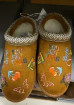 Cozy brown slippers featuring colorful embroidery with motivational phrases and designs.