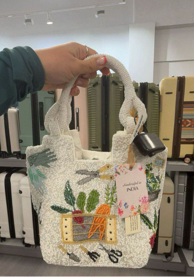 A stylish tote bag featuring intricate embroidery with craft-related designs.