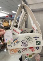 A stylish bag featuring various travel-themed embroidered patches, perfect for travel enthusiasts.