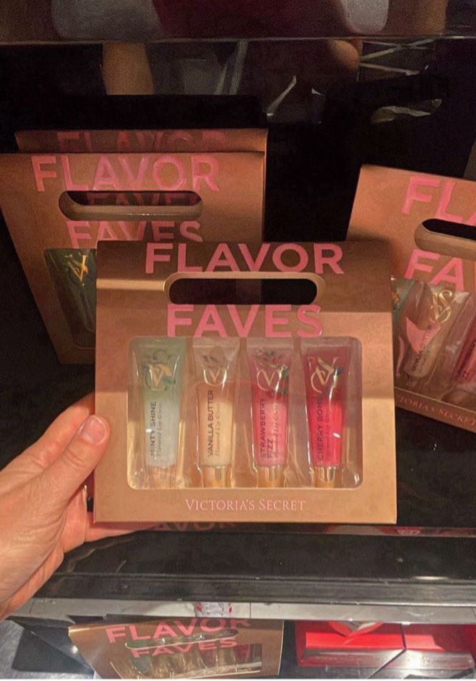 A set of three flavored lip glosses from Victoria’s Secret, featuring a variety of shades.