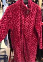 A cozy, patterned fleece robe in a vibrant pink color, perfect for lounging.