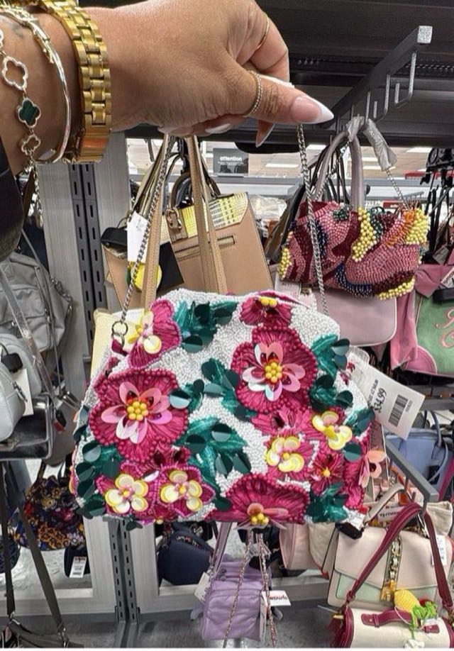 A vibrant floral beaded handbag featuring a mix of pink and green embellishments. Perfect for adding a pop of color to any outfit.