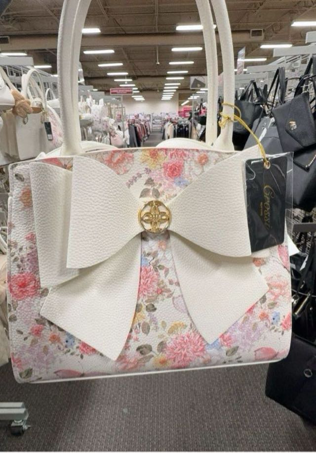 A stylish handbag featuring a floral design with a large white bow on the front.