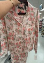 A soft floral pajama set featuring a button-up top and matching pants, perfect for comfortable sleepwear.
