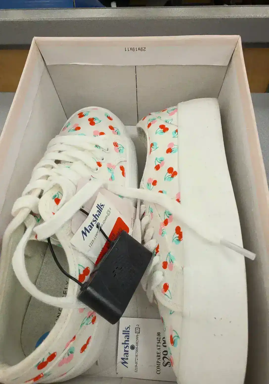 White sneakers with a colorful floral print, featuring a lace-up design.