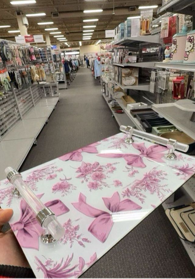 A decorative serving tray featuring a floral design with pink flowers on a white background, equipped with clear handles.