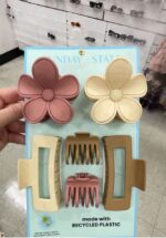 A set of four hair clips featuring two flower-shaped clips in pink and cream, along with two additional clips in neutral tones. Made from recycled plastic.