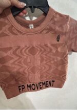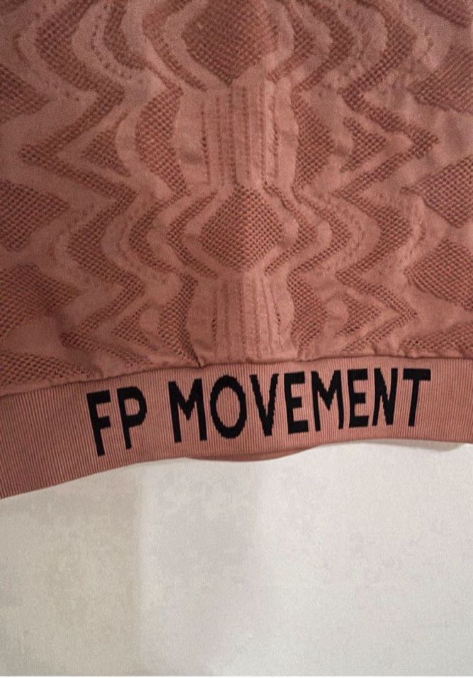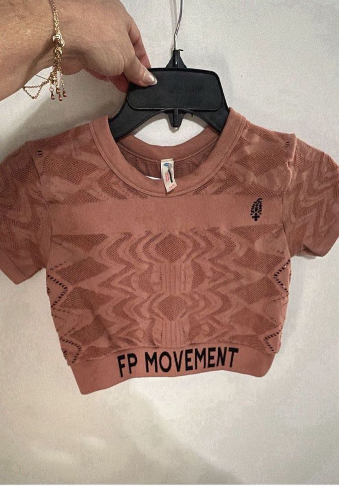 Free People Movement top. A stylish cropped top featuring a textured design and the brand name ‘FP Movement’ at the hem. Perfect for active wear or casual outings.