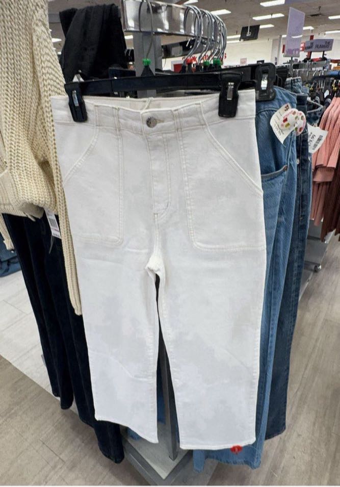 A pair of white denim pants featuring a classic design with front pockets. Size 28