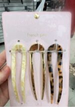 A set of three stylish French hair pins in various colors including cream, gold, and tortoiseshell.