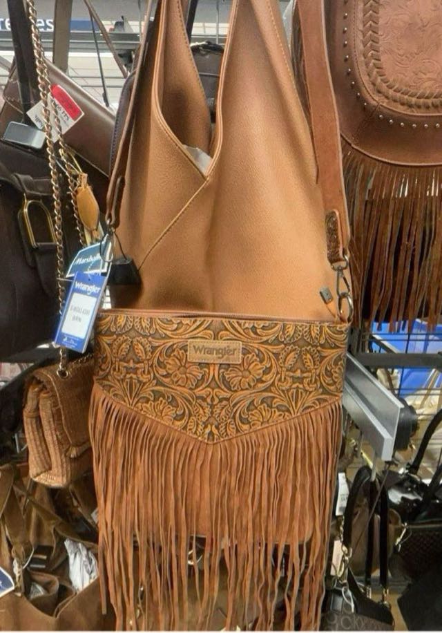 A stylish brown handbag featuring a fringe design and embossed detailing.