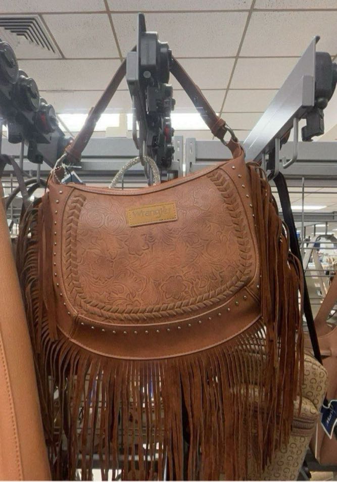 A stylish brown handbag featuring intricate floral embossing and fringe detailing.