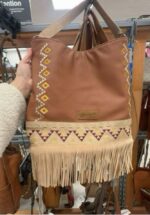 A stylish brown tote bag featuring decorative embroidery and fringe detailing at the bottom.