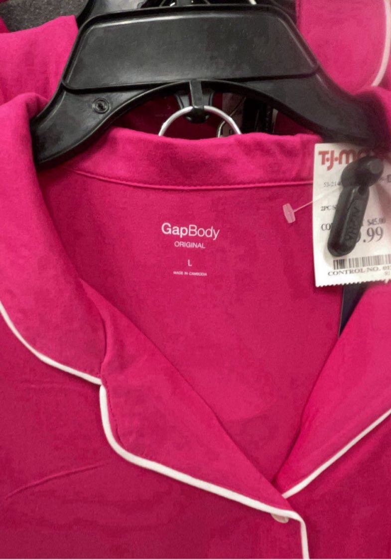 A soft pink pajama top and pants with white piping, perfect for comfortable sleepwear.
