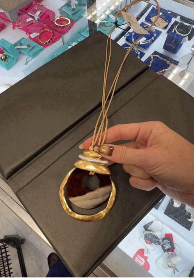 A stylish pendant necklace featuring a circular stone centerpiece with gold accents and a leather cord.