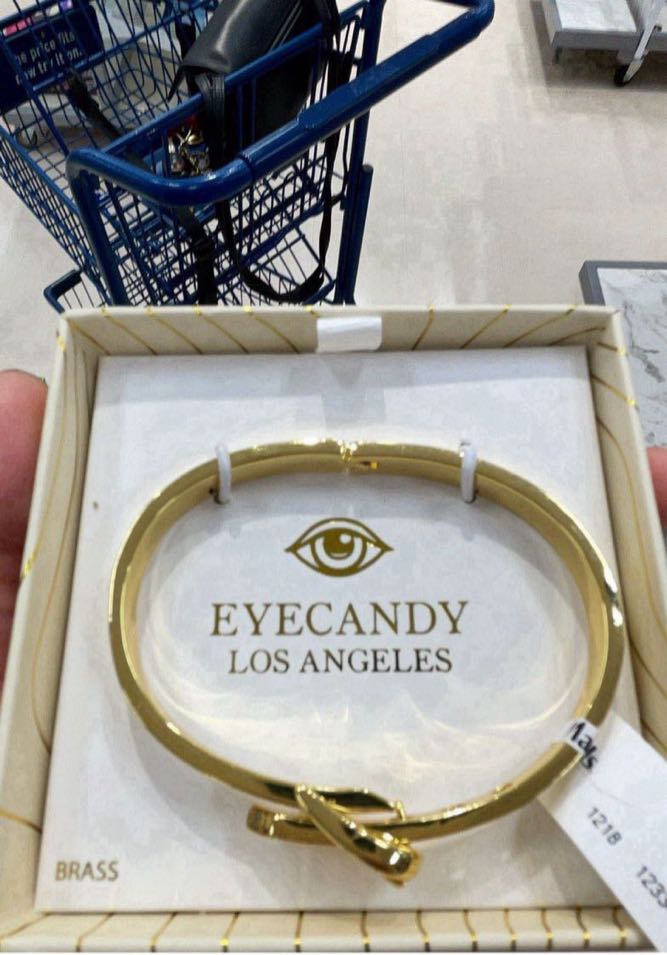 A stylish gold bracelet with a unique design, presented in a branded box.