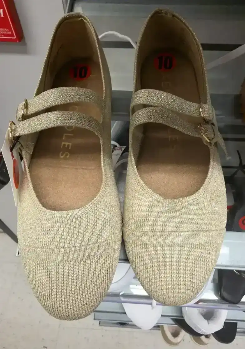 Stylish gold Mary Jane flats with a glittery finish and double strap design.