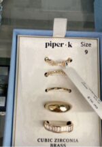 A set of five gold rings featuring various designs, including cubic zirconia accents.