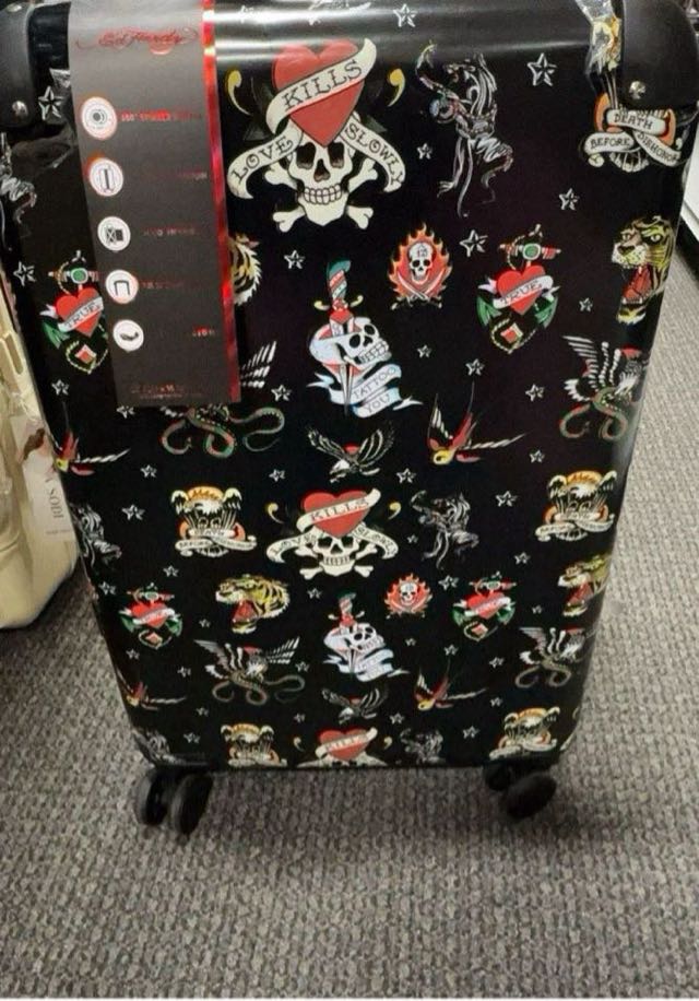 A stylish black suitcase featuring a vibrant graphic print with skulls, tattoos, and colorful designs.
