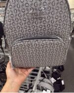 A stylish gray backpack featuring a repeating logo pattern and a front zip pocket.