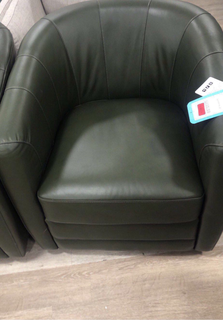 A stylish green leather armchair with a modern design, perfect for any living space.