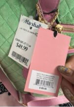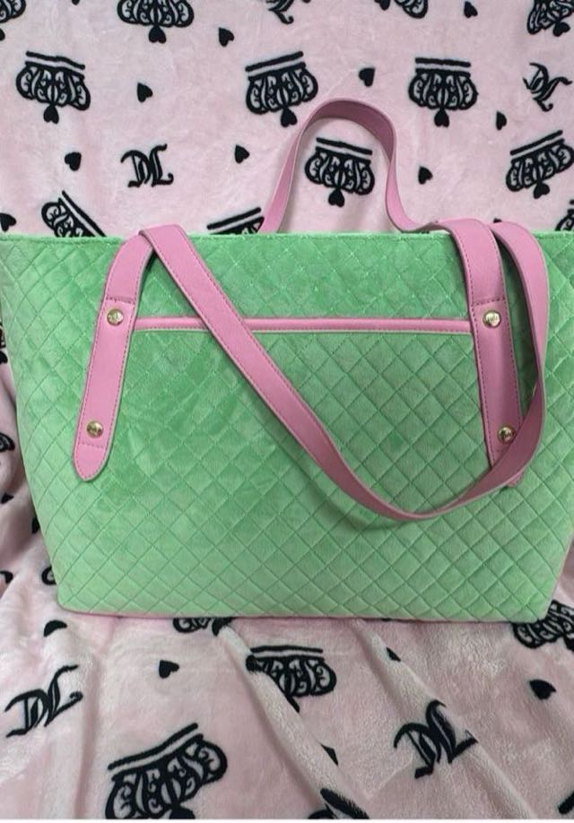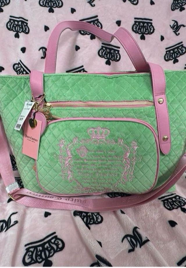 A stylish quilted tote bag in green with pink accents, featuring a decorative design and multiple compartments. Juicy Couture Retro Green Juicy Tale W…r