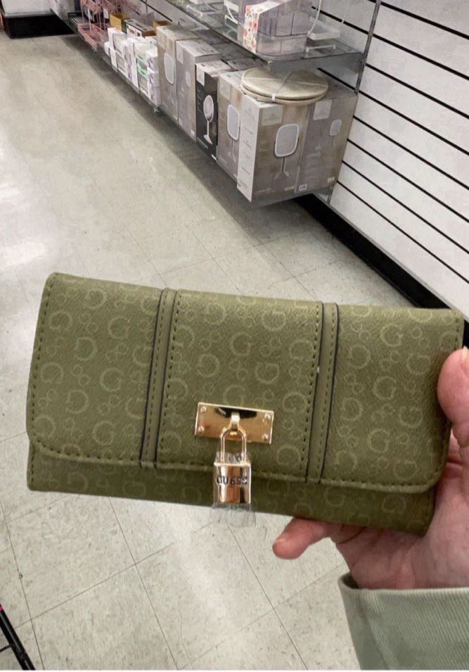 A stylish green wallet featuring a lock closure and embossed logo pattern.