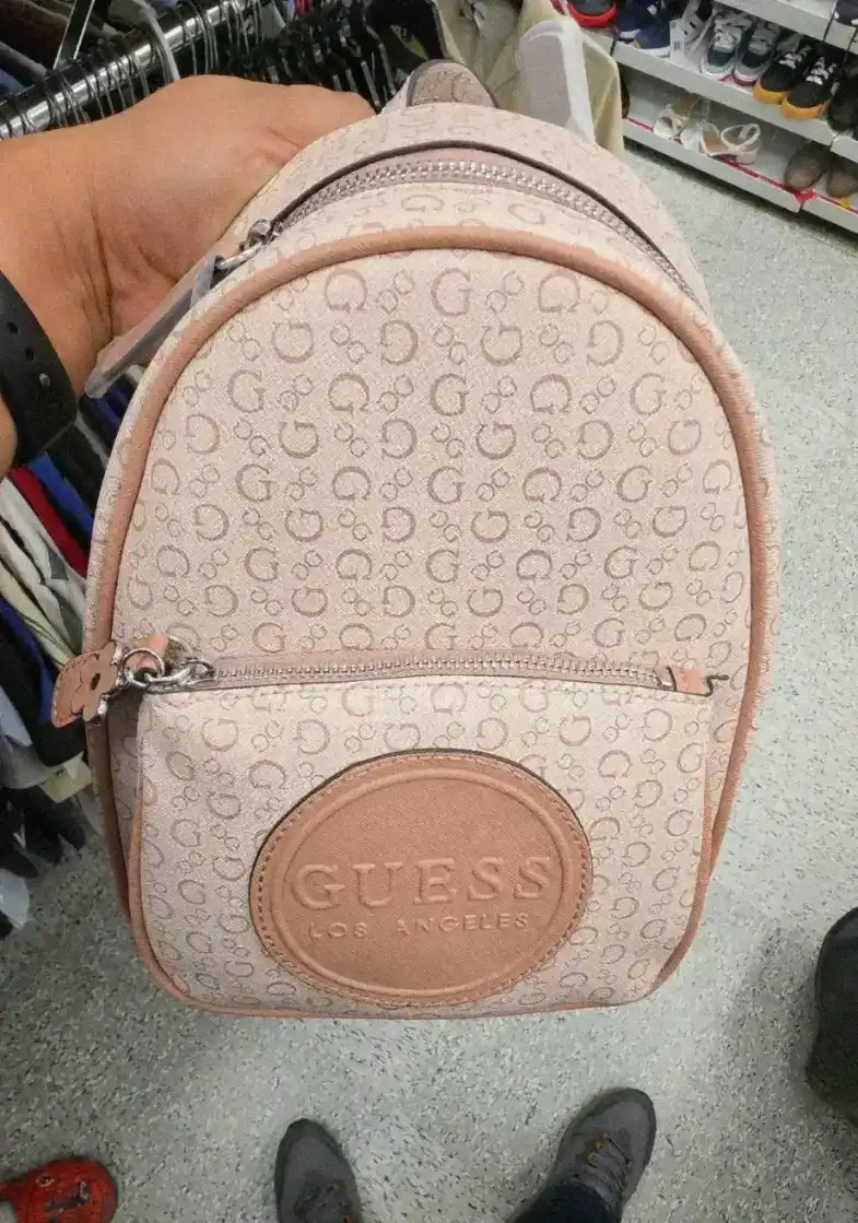 A stylish pink backpack featuring the Guess logo and a textured design. Perfect for everyday use or casual outings.