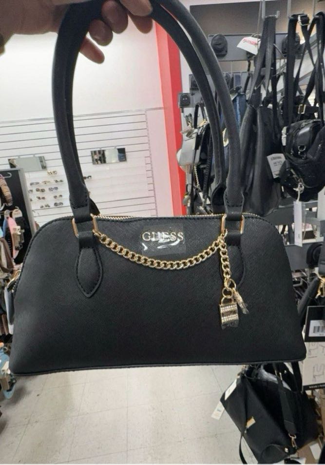 A stylish black handbag from Guess featuring a gold chain and lock detail.