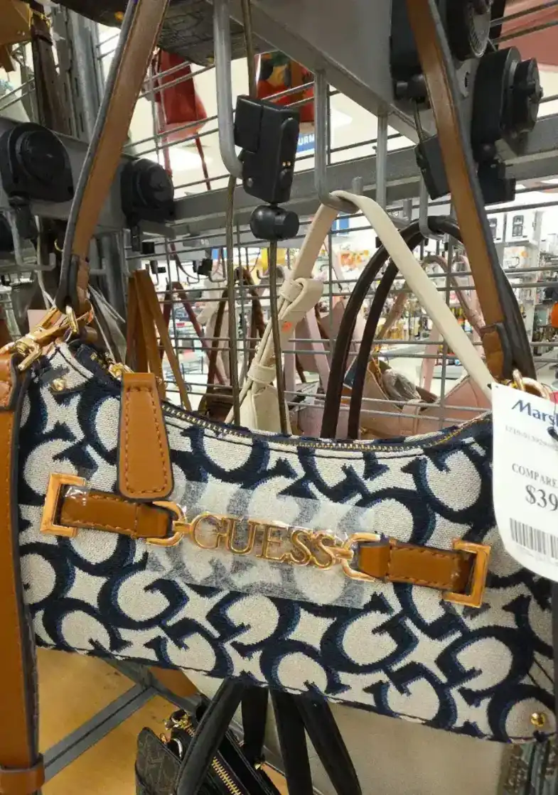 A stylish Guess handbag featuring a signature pattern and leather accents.