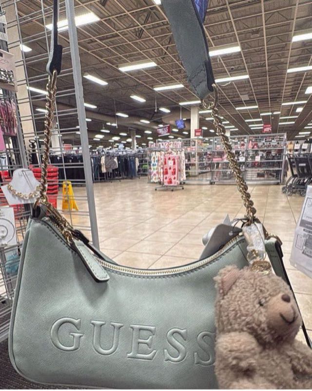 A stylish mint green handbag featuring the Guess logo and a teddy bear charm.