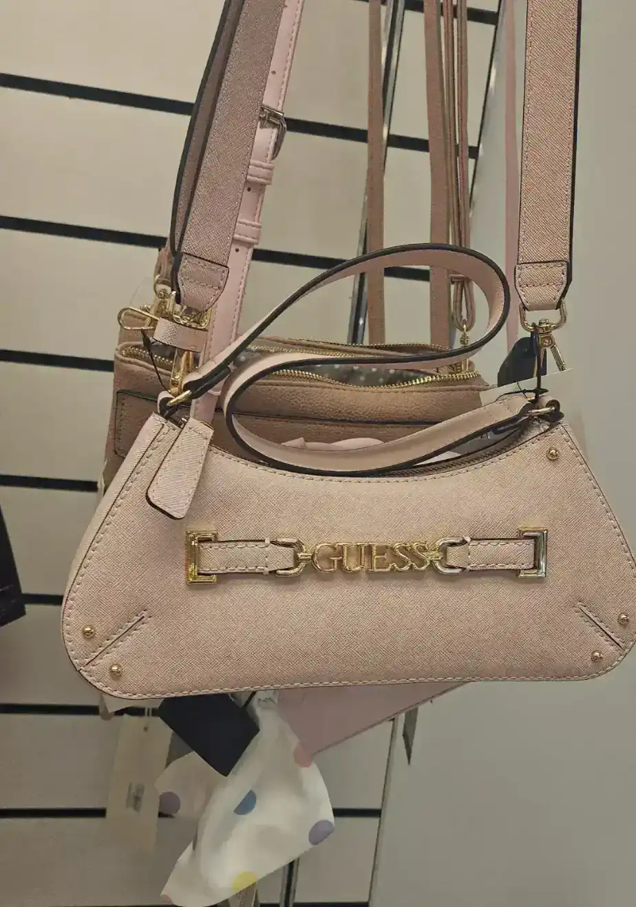 A stylish pink handbag featuring a gold-tone logo and multiple compartments.