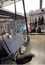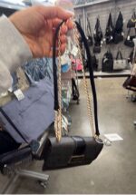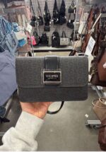 A stylish Guess handbag featuring a sleek design with a combination of black and gray colors. It includes a detachable chain strap for versatile carrying options.