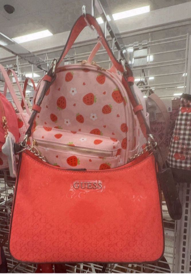 A stylish coral handbag from Guess featuring a glossy finish and a spacious interior. Perfect for everyday use or special occasions.