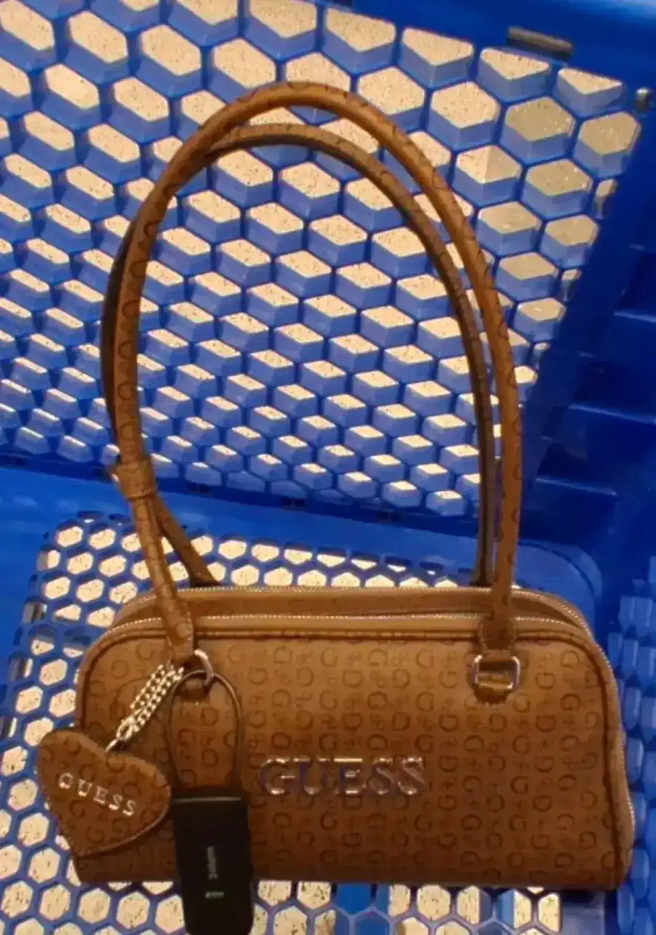 A stylish Guess handbag featuring a signature logo design and a detachable heart charm. Perfect for everyday use or special occasions.
