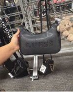 A stylish black handbag featuring the brand name ‘GUESS’ embossed on the front, complemented by a chain strap and a teddy bear charm.