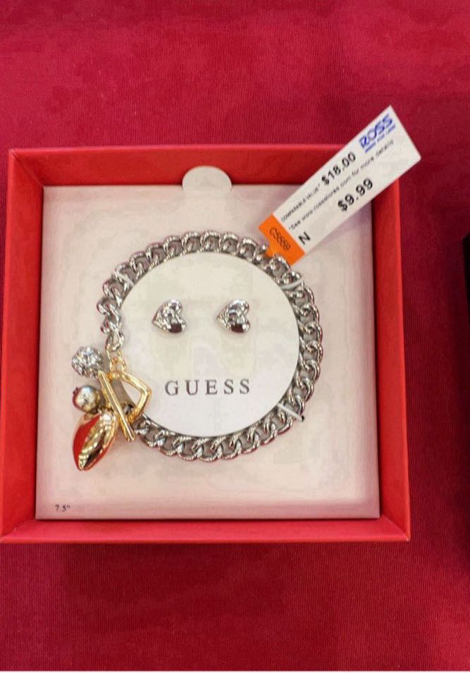 A stylish jewelry set featuring a bracelet and matching earrings, designed by Guess.