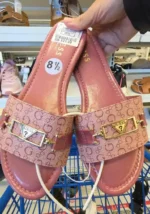 Stylish pink slide sandals featuring a logo design and decorative gold accents.