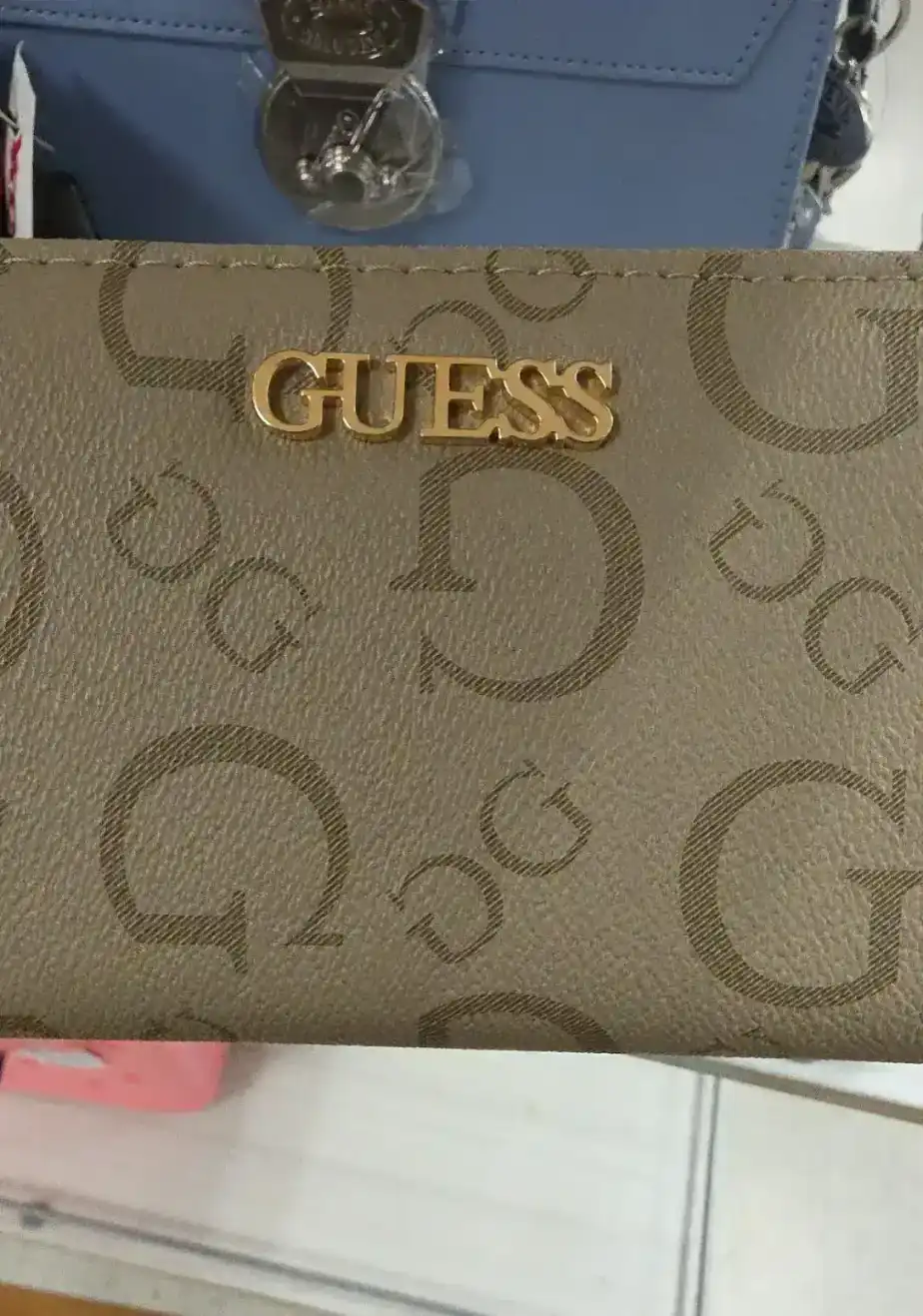 A stylish wallet featuring the GUESS logo and a patterned design.
