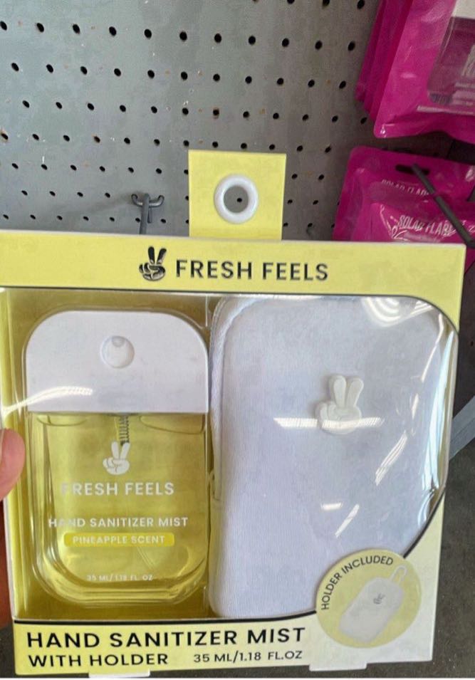 A hand sanitizer mist in a pineapple scent, packaged with a holder for convenience.