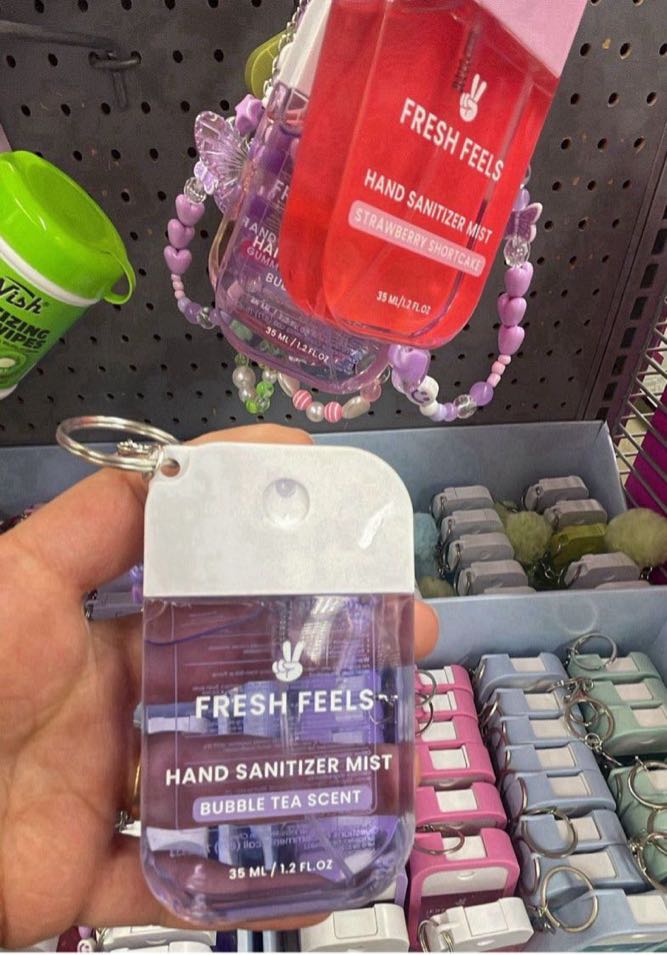 A portable hand sanitizer mist in a convenient keychain format, available in various scents. This item is perfect for on-the-go sanitization.