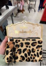 A stylish handmade clutch featuring a leopard print design with a decorative tassel.