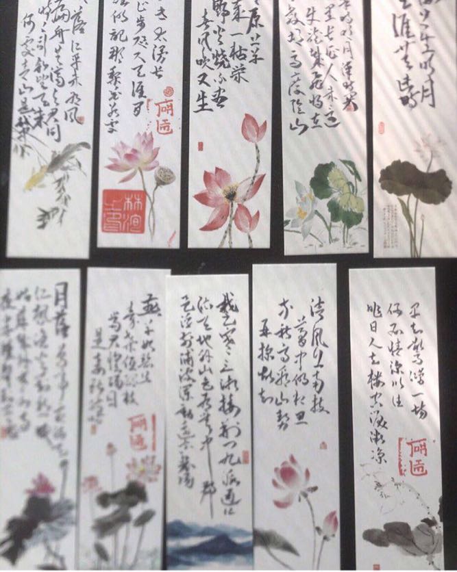 A collection(10pcs in Total of decorative traditional Chinese calligraphy bookmarks and watercolor paintings of flowers and landscapes.