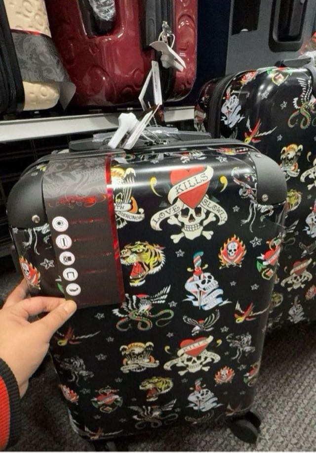 A stylish hard shell suitcase featuring a vibrant design with various graphics including skulls and tigers.