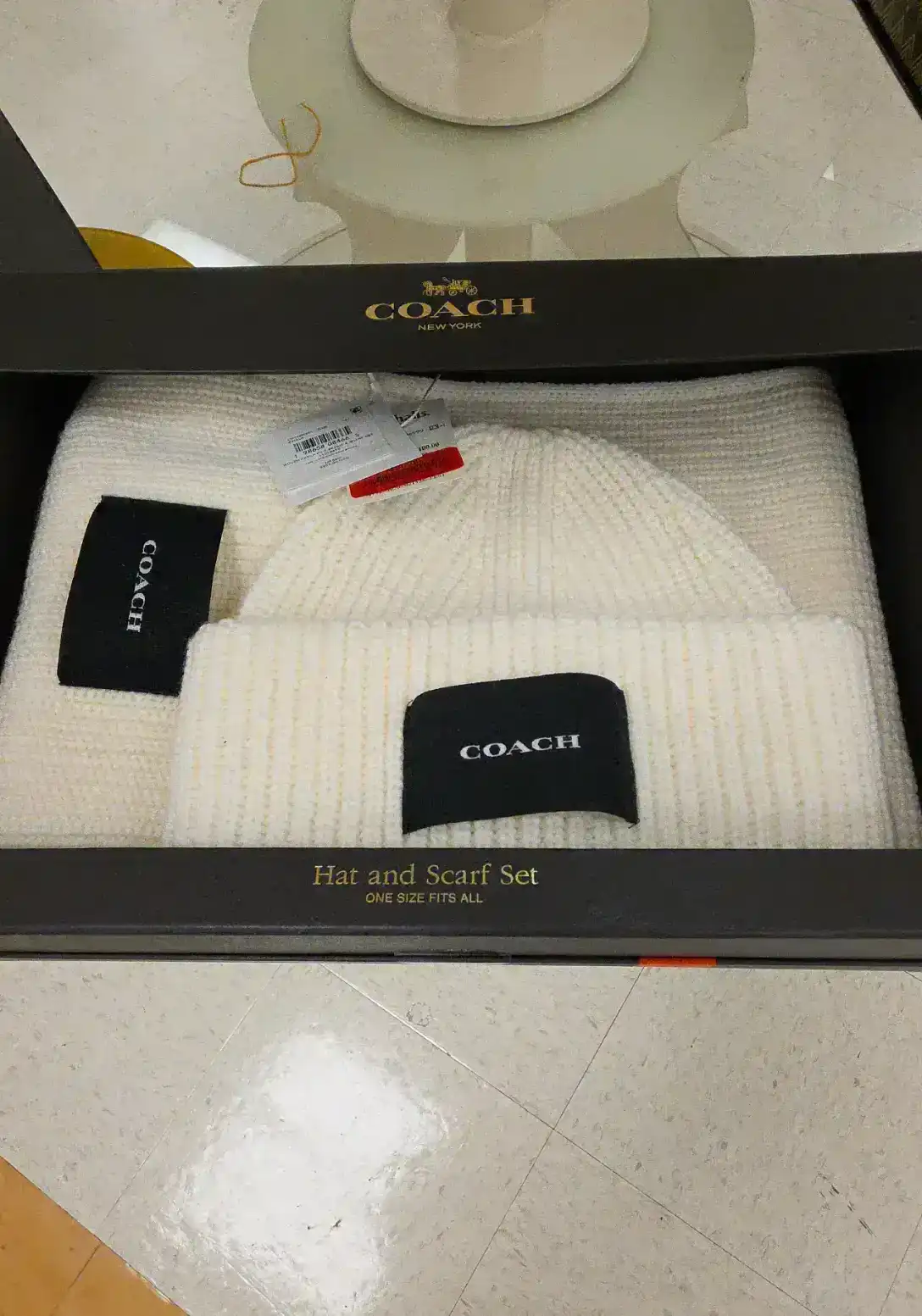 A stylish hat and scarf set in cream color, perfect for winter wear.