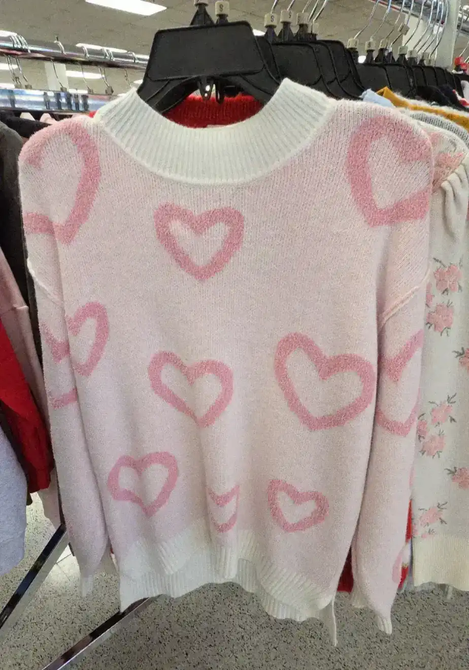 A cozy pink sweater featuring a playful heart pattern in a soft knit fabric. Size s